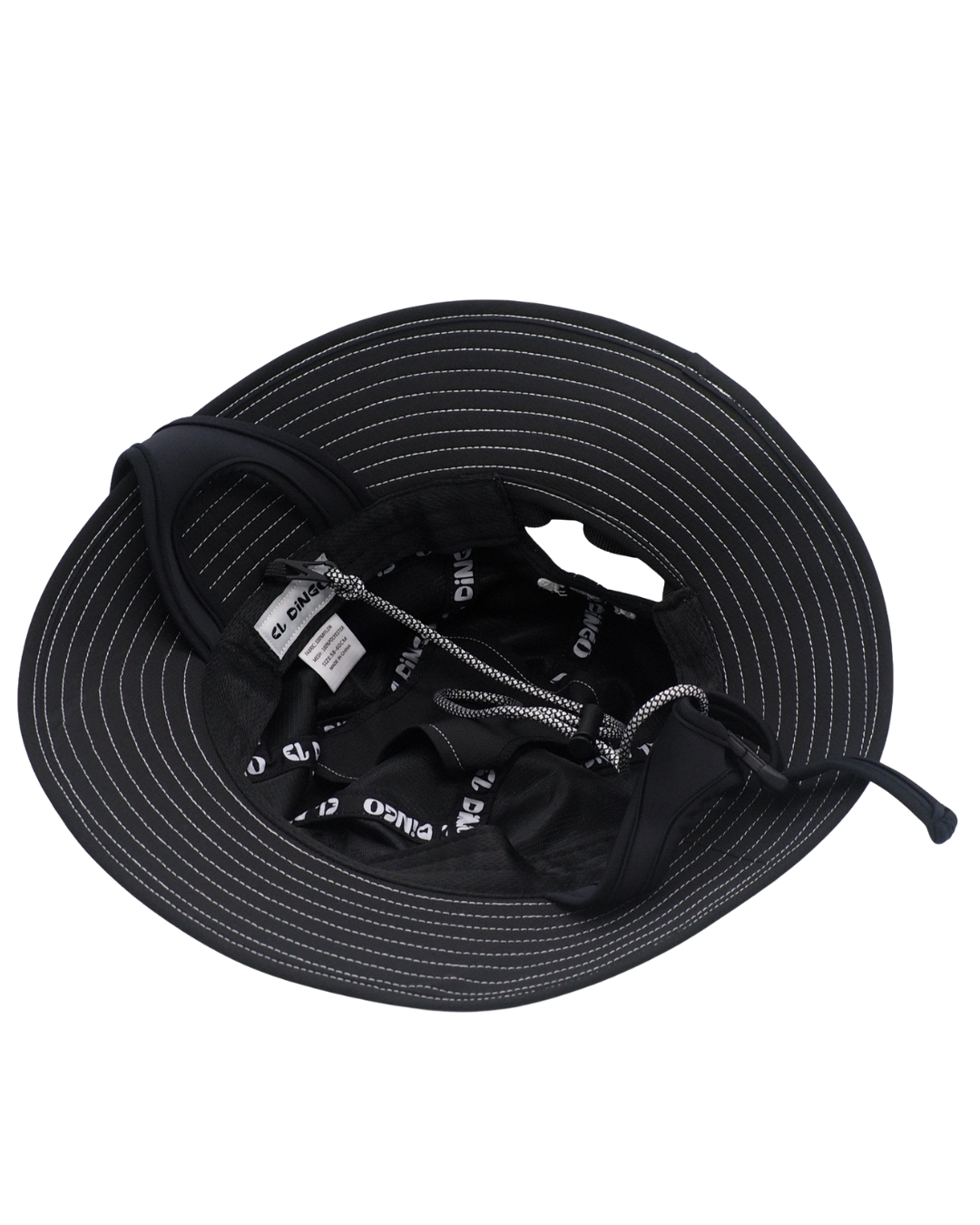 Featuring a firm insert at the front of the hat so the brim never flops in front of your eyes, but still soft enough to duck dive this wide brim hat is the pinnacle of performance and sun protection. Now available in all black with contrast white stitching for those who want to stay on the down low. The soft neoprene chin strap adds a comfortable, secure fit, or wear unbuckled on the worksite, mowing the lawns, or whatever floats your boat.